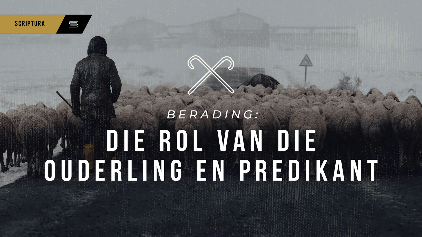 Waar moet berading in werklikheid begin en wie is getaak daarmee, en geroep daartoe? Is die kerk bekwaam as lewende liggaam om gelowiges te bemoedig en te beraad? Wat is die roeping van ouderling of herder in die gemeente, en hoe kan ouderlinge berading gehoorsaam aanbied in hul daaglikse kontak met gelowiges? Is berading net bemoediging of is dit die weerlegging van dwaling, bestraffing van die sonde, en bemoediging van die gelowige met die waarheid van die evangelie? Handelinge 20:28 “Pas julleself op, en ook die hele kudde oor wie die Heilige Gees julle as opsieners aangestel het om die gemeente van God, wat Hy deur sy eie bloed verwerf het, herderlik te versorg.”