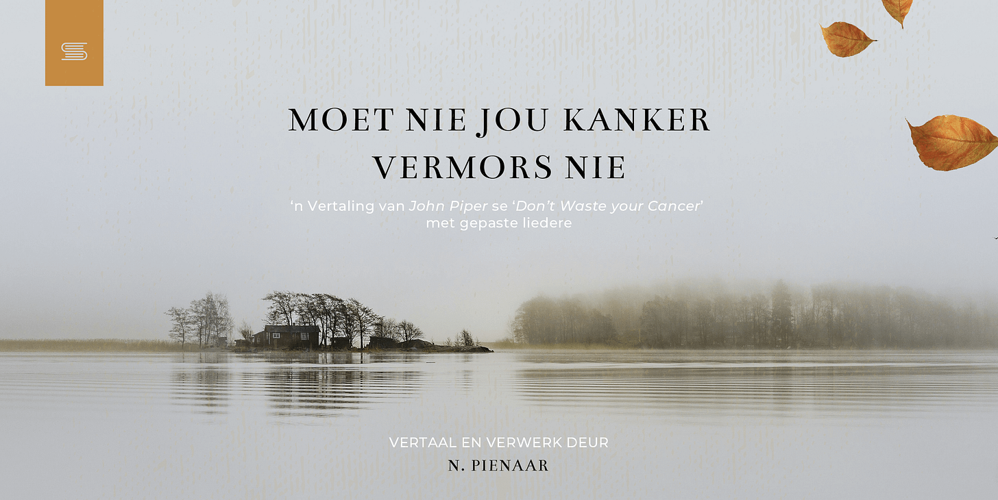 Maar genesing is nie God se plan vir almal in hierdie lewe nie. En daar is baie ander maniere om ons kankers te vermors. Soos ek vir myself gebid het, en steeds doen, bid ek ook vir jou, dat ons nie hierdie pyn sal vermors nie.