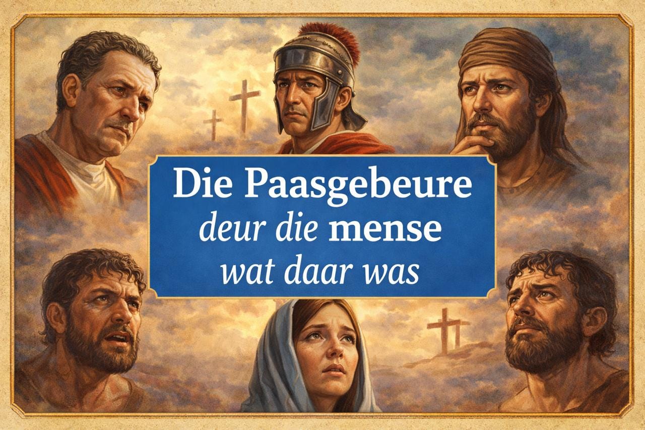 Tydens Paasfees kan ons lees en dink oor die getuienis van al die mense wat voor, tydens en na Jesus se kruisiging by Hom was, en alles waargeneem en ervaar het. Dan sien ons mooi hoe ons met elkeen van hulle kan vereenselwig, en soortgelyke swakhede het. Ons besef weereens ons groot nood vir Christus se verlossing, maar veral hoe groot God se genade is.